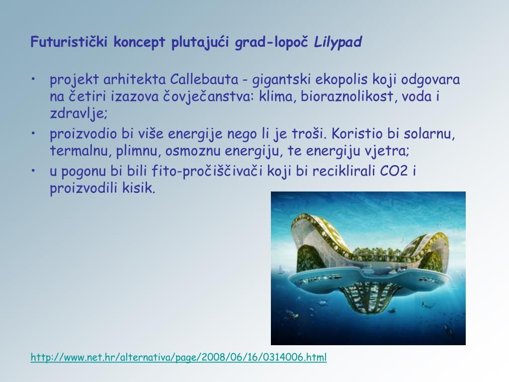 Futuristički koncept plutajući grad-lopoč Lilypad • projekt arhitekta Callebauta - gigantski ekopolis koji odgovara na četiri izazova čovječanstva: klima, bioraznolikost, voda i zdravlje; • proizvodio bi više energije nego li je troši. Koristio bi solarnu, termalnu, plimnu, osmoznu energiju, te energiju vjetra; • u pogonu bi bili fito-pročiščivači koji bi reciklirali CO2 i proizvodili kisik. http://www.net.hr/alternativa/page/2008/06/16/0314006.html