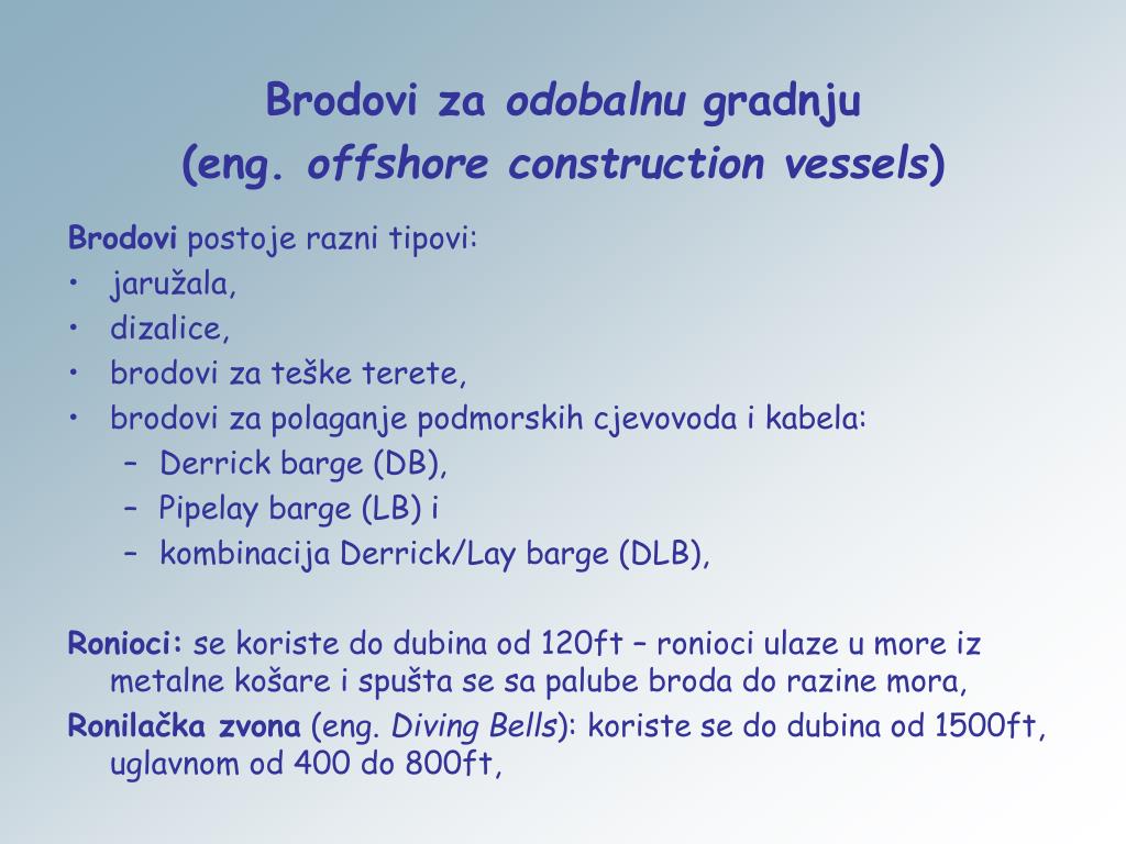 Brodovi za odobalnu gradnju (eng. offshore construction vessels) Brodovi postoje razni tipovi: • jaružala, • dizalice, • brodovi za teške terete, • brodovi za polaganje podmorskih cjevovoda i kabela: • Derrick barge (DB), • Pipelay barge (LB) i • kombinacija Derrick/Lay barge (DLB), Ronioci: se koriste do dubina od 120ft – ronioci ulaze u more iz metalne košare i spušta se sa palube broda do razine mora, Ronilačka zvona (eng. Diving Bells): koriste se do dubina od 1500ft, uglavnom od 400 do 800ft,