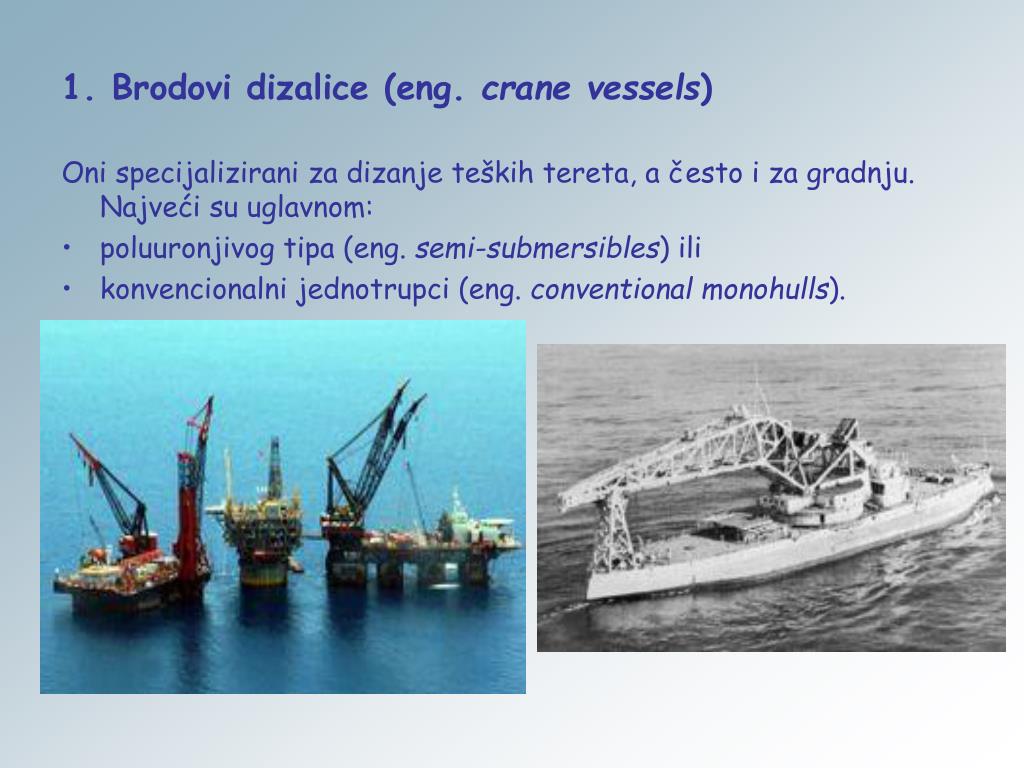 1. Brodovi dizalice (eng. crane vessels) Oni specijalizirani za dizanje teških tereta, a često i za gradnju. Najveći su uglavnom: • poluuronjivog tipa (eng. semi-submersibles) ili • konvencionalni jednotrupci (eng. conventional monohulls).