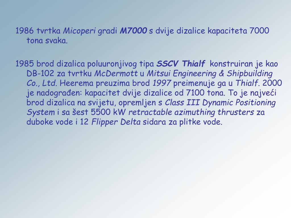 1986 tvrtka Micoperi gradi M7000 s dvije dizalice kapaciteta 7000 tona svaka. 1985 brod dizalica poluuronjivog tipa SSCV Thialf konstruiran je kao DB-102 za tvrtku McDermott u Mitsui Engineering & Shipbuilding Co., Ltd. Heerema preuzima brod 1997 preimenuje ga u Thialf. 2000 je nadograđen: kapacitet dvije dizalice od 7100 tona. To je najveći brod dizalica na svijetu, opremljen s Class III Dynamic Positioning System i sa šest 5500 kW retractable azimuthing thrusters za duboke vode i 12 Flipper Delta sidara za plitke vode.