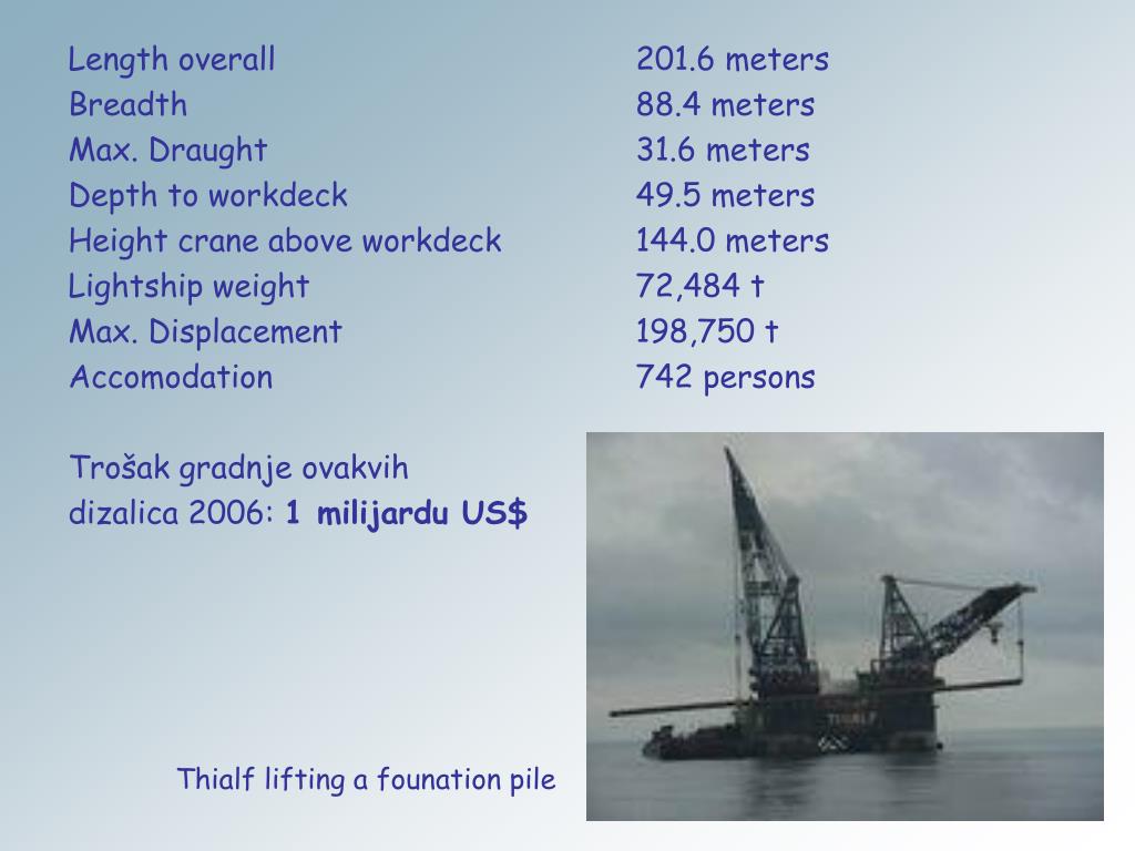 Length overall 201.6 meters Breadth 88.4 meters Max. Draught 31.6 meters Depth to workdeck 49.5 meters Height crane above workdeck 144.0 meters Lightship weight 72,484 t Max. Displacement 198,750 t Accomodation 742 persons Trošak gradnje ovakvih dizalica 2006: 1 milijardu US$ Thialf lifting a founation pile