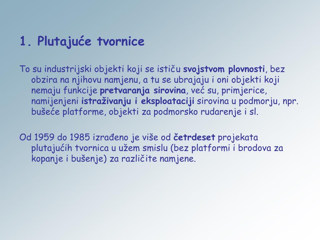 1. Plutajuće tvornice To su industrijski objekti koji se ističu svojstvom plovnosti, bez obzira na njihovu namjenu, a tu se ubrajaju i oni objekti koji nemaju funkcije pretvaranja sirovina, već su, primjerice, namijenjeni istraživanju i eksploataciji sirovina u podmorju, npr. bušeće platforme, objekti za podmorsko rudarenje i sl. Od 1959 do 1985 izrađeno je više od četrdeset projekata plutajućih tvornica u užem smislu (bez platformi i brodova za kopanje i bušenje) za različite namjene.