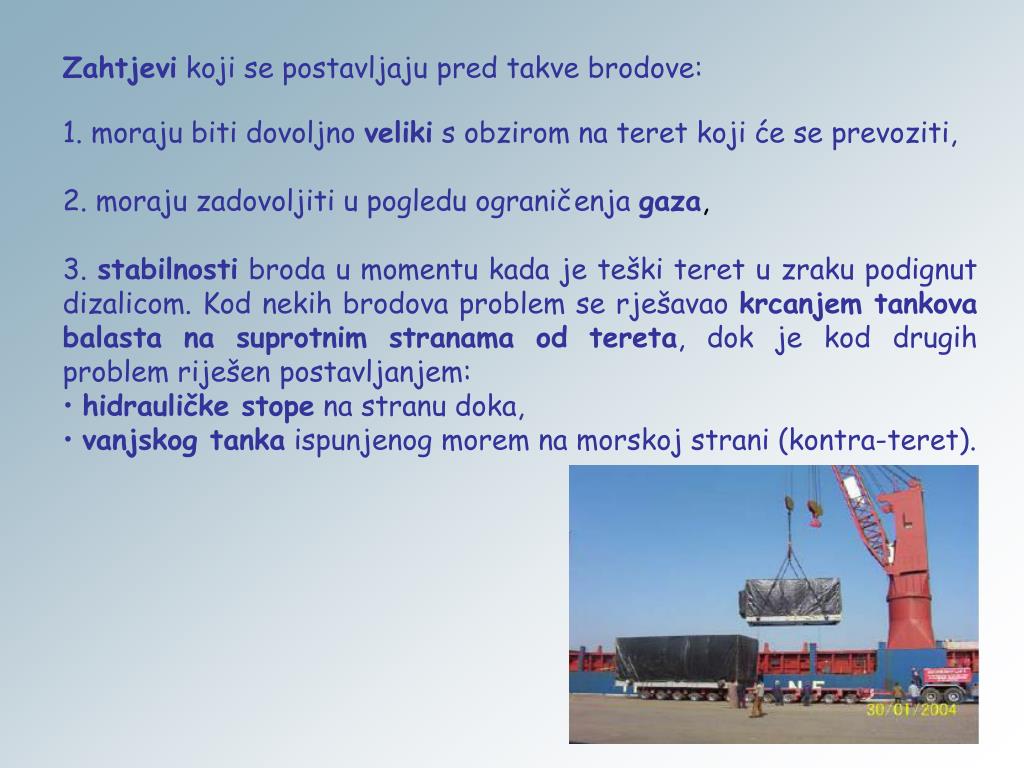 Zahtjevi koji se postavljaju pred takve brodove: • 1. moraju biti dovoljno veliki s obzirom na teret koji će se prevoziti, • 2. moraju zadovoljiti u pogledu ograničenja gaza, • 3. stabilnosti broda u momentu kada je teški teret u zraku podignut dizalicom. Kod nekih brodova problem se rješavao krcanjem tankova balasta na suprotnim stranama od tereta, dok je kod drugih problem riješen postavljanjem: • hidrauličke stope na stranu doka, • vanjskog tanka ispunjenog morem na morskoj strani (kontra-teret).