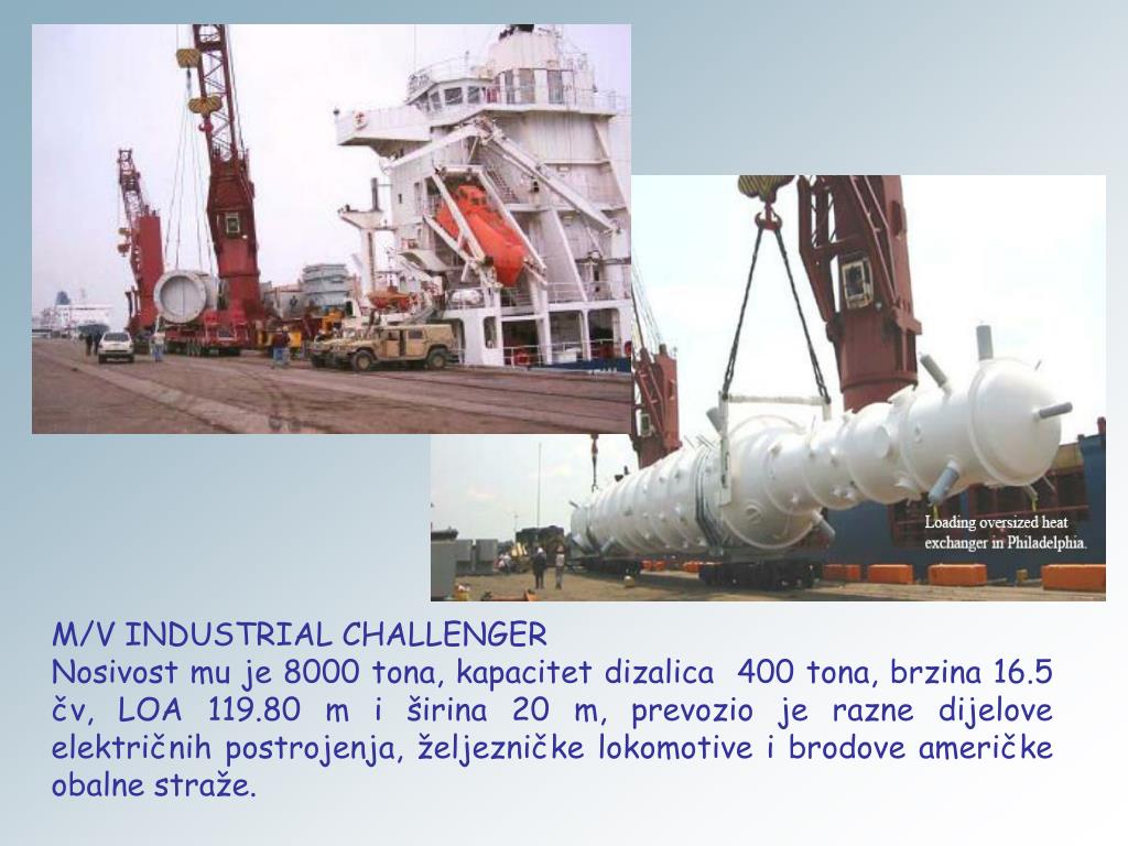 M/V INDUSTRIAL CHALLENGER Nosivost mu je 8000 tona, kapacitet dizalica 400 tona, brzina 16.5 čv, LOA119.80 m i širina 20 m, prevozio je razne dijelove električnih postrojenja, željezničke lokomotive i brodove američke obalne straže.
