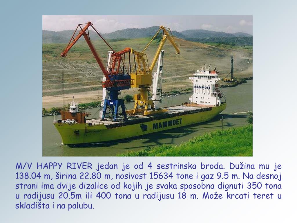 M/V HAPPY RIVER jedan je od 4 sestrinska broda. Dužina mu je 138.04 m, širina 22.80 m, nosivost 15634 tone i gaz 9.5 m. Na desnoj strani ima dvije dizalice od kojih je svaka sposobna dignuti 350 tona u radijusu 20.5m ili 400 tona u radijusu 18 m. Može krcati teret u skladišta i na palubu.