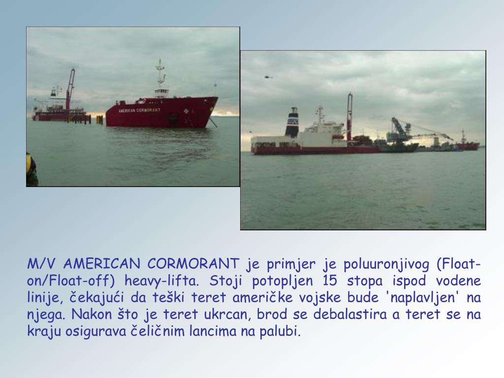 M/V AMERICAN CORMORANT je primjer je poluuronjivog (Float-on/Float-off) heavy-lifta. Stoji potopljen 15 stopa ispod vodene linije, čekajući da teški teret američke vojske bude 'naplavljen' na njega. Nakon što je teret ukrcan, brod se debalastira a teret se na kraju osigurava čeličnim lancima na palubi.