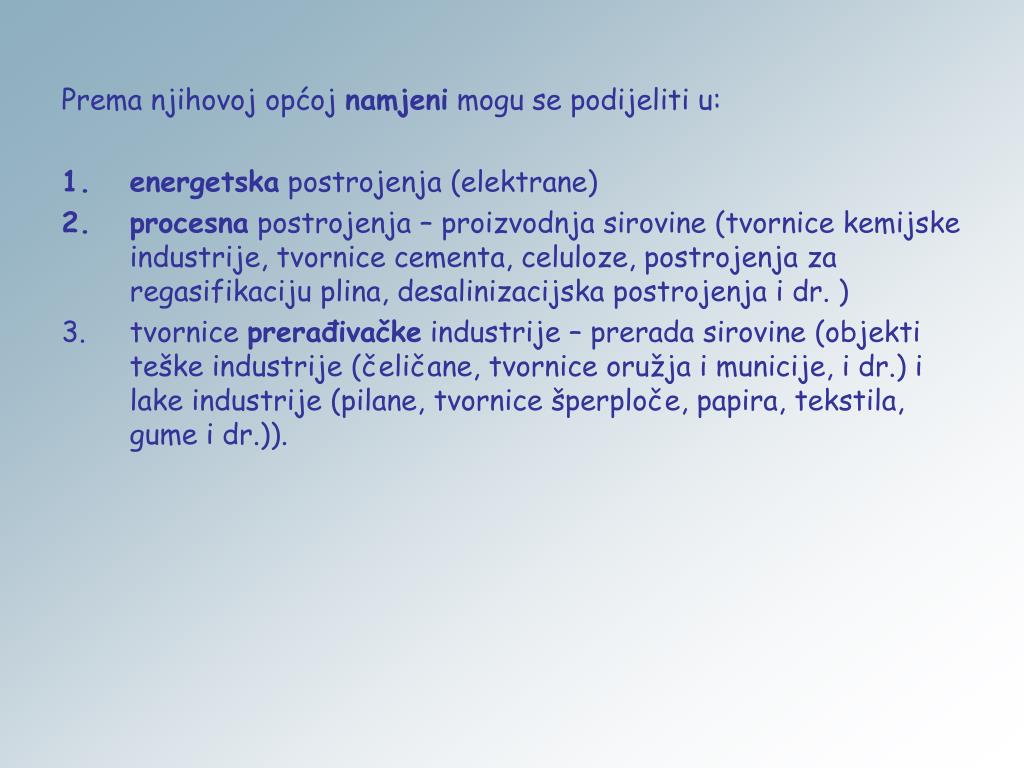 Prema njihovoj općoj namjeni mogu se podijeliti u: • energetska postrojenja (elektrane) • procesna postrojenja – proizvodnja sirovine (tvornice kemijske industrije, tvornice cementa, celuloze, postrojenja za regasifikaciju plina, desalinizacijska postrojenja i dr. ) • tvornice prerađivačke industrije – prerada sirovine (objekti teške industrije (čeličane, tvornice oružja i municije, i dr.) i lake industrije (pilane, tvornice šperploče, papira, tekstila, gume i dr.)).