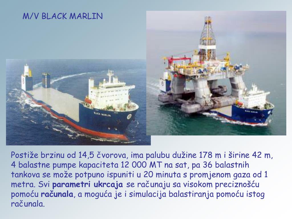 M/V BLACK MARLIN Postiže brzinu od 14,5 čvorova, ima palubu dužine 178 m i širine 42 m, 4 balastne pumpe kapaciteta 12 000 MT na sat, pa 36 balastnih tankova se može potpuno ispuniti u 20 minuta s promjenom gaza od 1 metra. Svi parametri ukrcaja se računaju sa visokom preciznošću pomoću računala, a moguća je i simulacija balastiranja pomoću istog računala.