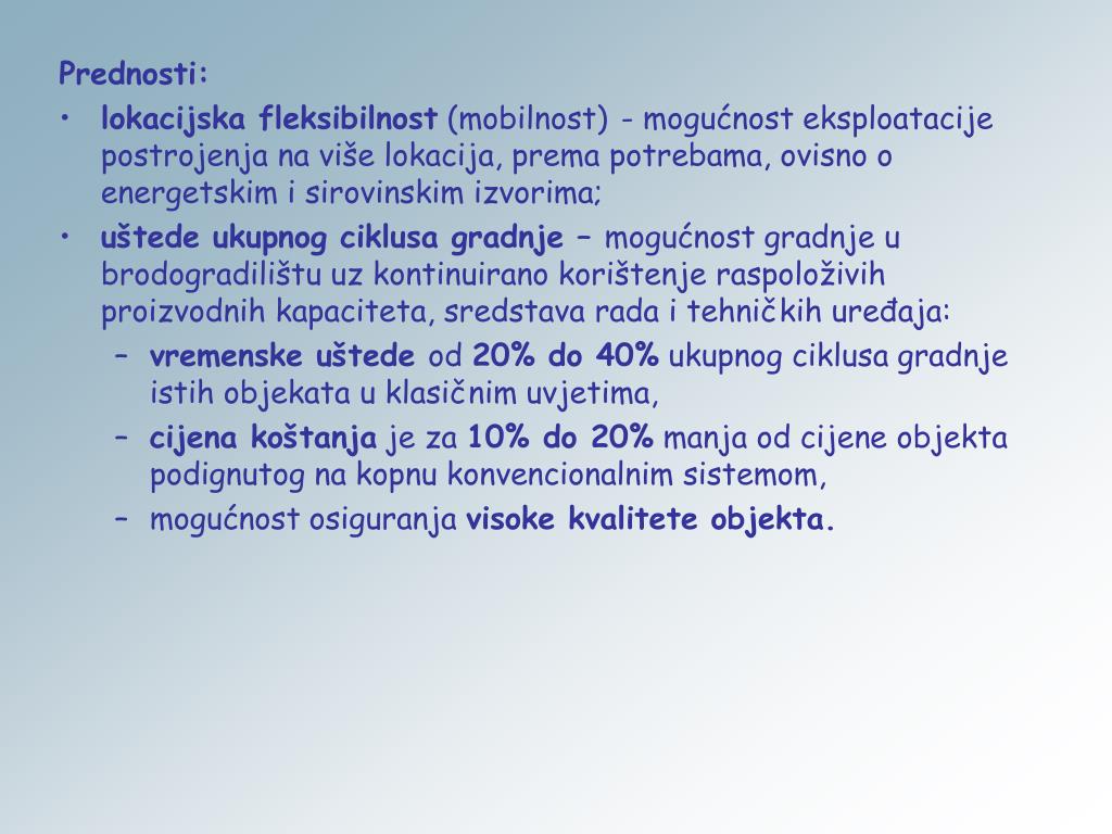 Prednosti: • lokacijska fleksibilnost (mobilnost)- mogućnost eksploatacije postrojenja na više lokacija, prema potrebama, ovisno o energetskim i sirovinskim izvorima; • uštede ukupnog ciklusa gradnje – mogućnost gradnje u brodogradilištu uz kontinuirano korištenje raspoloživih proizvodnih kapaciteta, sredstava rada i tehničkih uređaja: • vremenske uštede od 20% do 40% ukupnog ciklusa gradnje istih objekata u klasičnim uvjetima, • cijena koštanja je za 10% do 20% manja od cijene objekta podignutog na kopnu konvencionalnim sistemom, • mogućnost osiguranja visoke kvalitete objekta.
