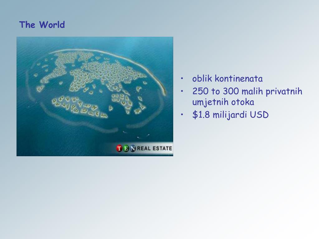 The World • oblik kontinenata • 250 to 300 malih privatnih umjetnih otoka • $1.8 milijardi USD