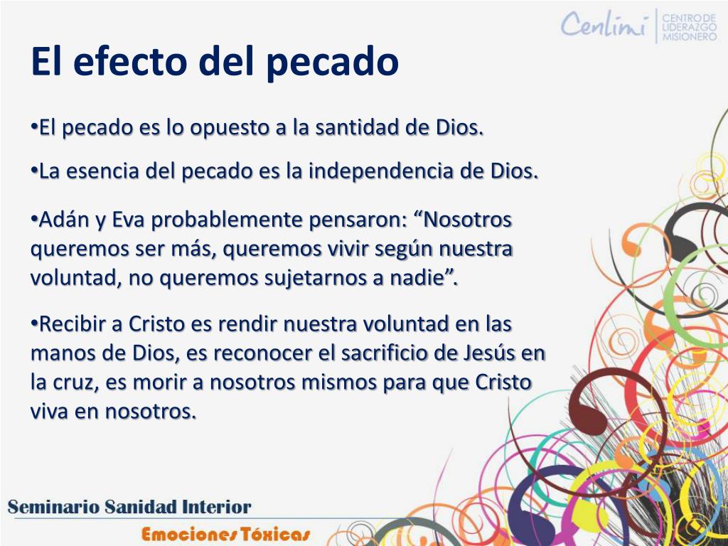 El efecto del pecado El pecado es lo opuesto a la santidad de Dios. La esencia del pecado es la independencia de Dios. Adán y Eva probablemente pensaron: “Nosotros queremos ser más, queremos vivir según nuestra voluntad, no queremos sujetarnos a nadie”. Recibir a Cristo es rendir nuestra voluntad en las manos de Dios, es reconocer el sacrificio de Jesús en la cruz, es morir a nosotros mismos para que Cristo viva en nosotros.