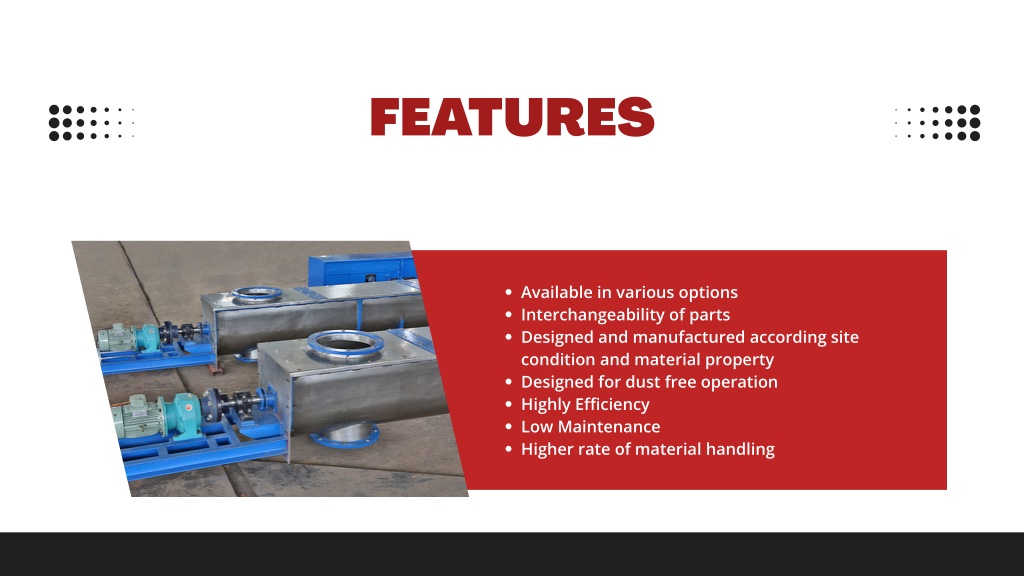 FEATURES Available in various options Interchangeability of parts Designed and manufactured according site condition and material property Designed for dust free operation Highly Efficiency Low Maintenance Higher rate of material handling