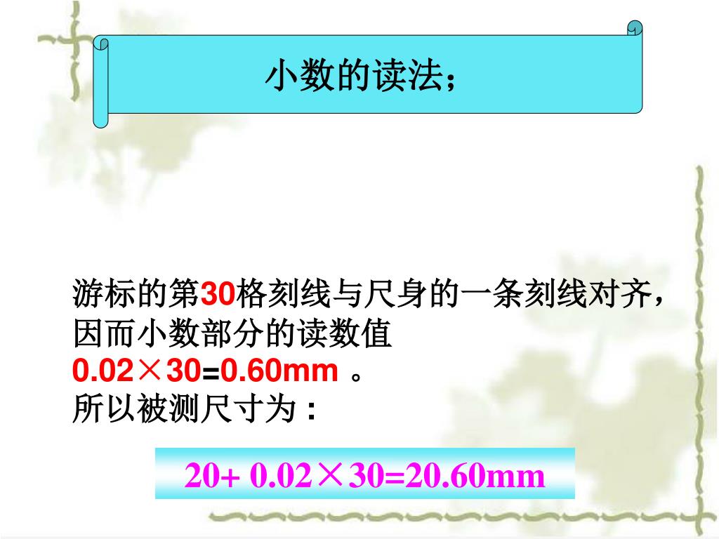 小数的读法; • 游标的第30格刻线与尺身的一条刻线对齐,因而小数部分的读数值0.02×30=0.60mm 。 • 所以被测尺寸为 : 20+ 0.02×30=20.60mm