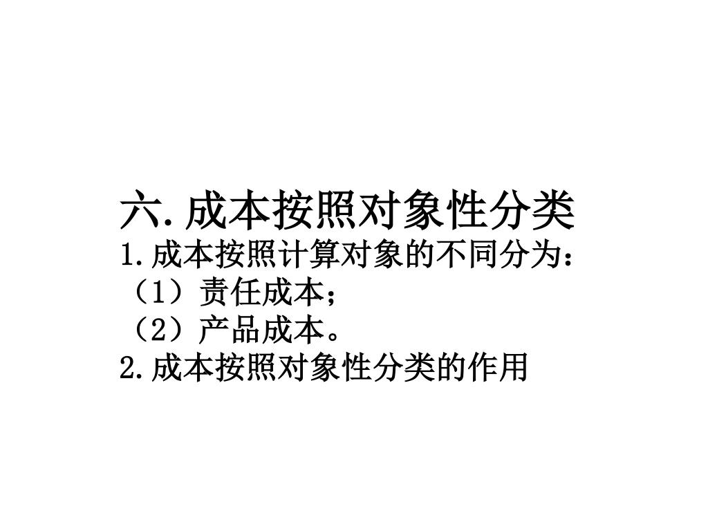 六.成本按照对象性分类 1.成本按照计算对象的不同分为: (1)责任成本; (2)产品成本。 2.成本按照对象性分类的作用