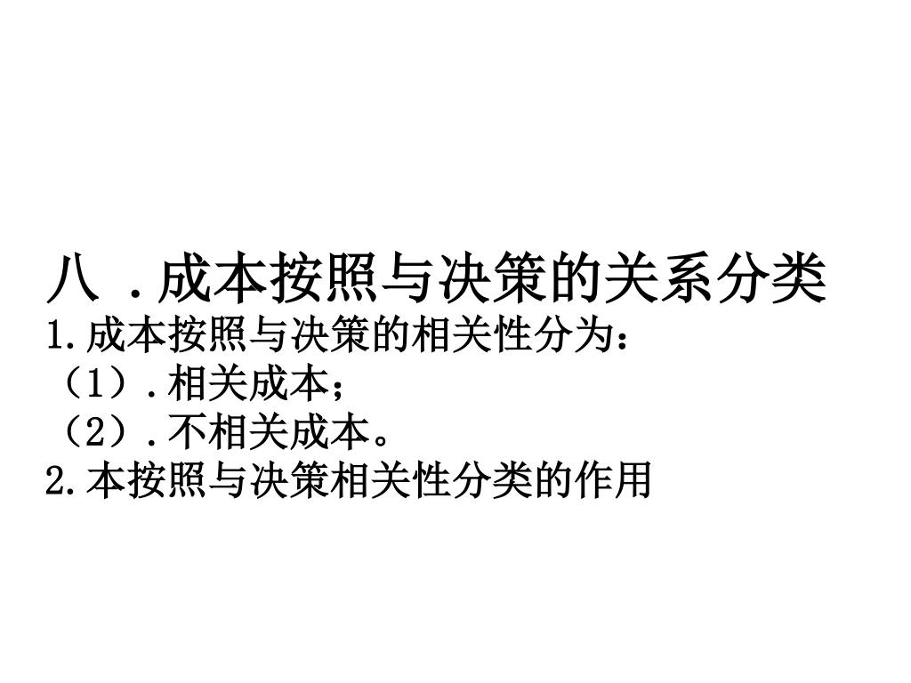 八 .成本按照与决策的关系分类 1.成本按照与决策的相关性分为: (1).相关成本; (2).不相关成本。 2.本按照与决策相关性分类的作用
