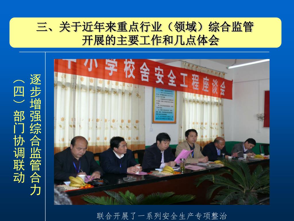 三、关于近年来重点行业(领域)综合监管开展的主要工作和几点体会三、关于近年来重点行业(领域)综合监管开展的主要工作和几点体会 逐步增强综合监管合力 ︵四︶部门协调联动 联合开展了一系列安全生产专项整治