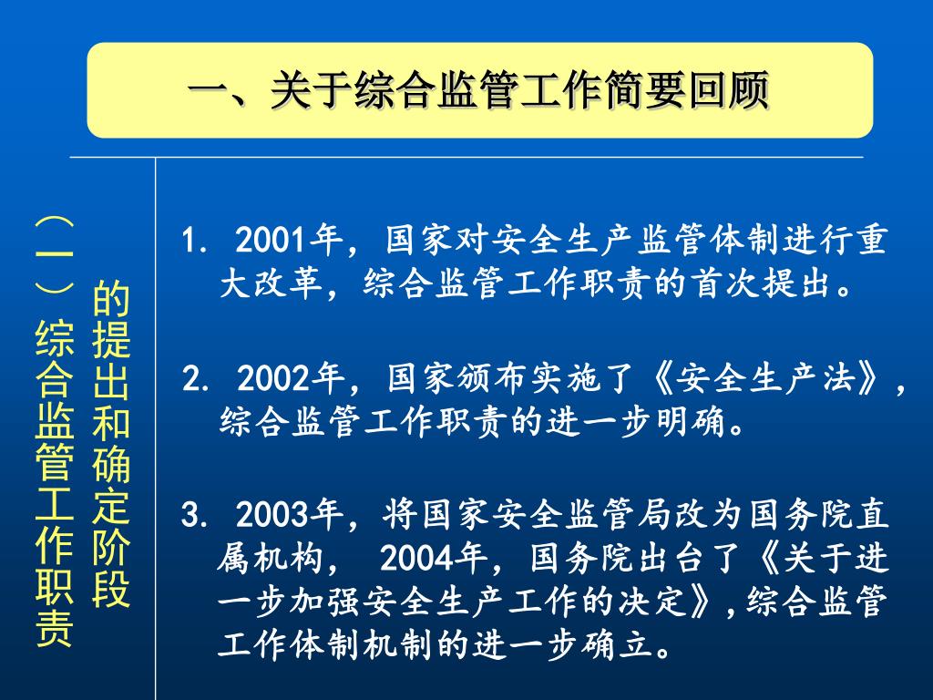 一、关于综合监管工作简要回顾 ︵一︶综合监管工作职责 的提出和确定阶段 1. 2001年,国家对安全生产监管体制进行重大改革,综合监管工作职责的首次提出。 2. 2002年,国家颁布实施了《安全生产法》,综合监管工作职责的进一步明确。 3. 2003年,将国家安全监管局改为国务院直属机构, 2004年,国务院出台了《关于进一步加强安全生产工作的决定》,综合监管工作体制机制的进一步确立。