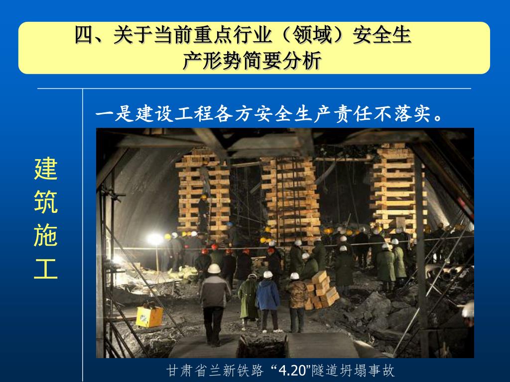 四、关于当前重点行业(领域)安全生产形势简要分析四、关于当前重点行业(领域)安全生产形势简要分析 一是建设工程各方安全生产责任不落实。 建 筑 施 工 甘肃省兰新铁路“4.20”隧道坍塌事故