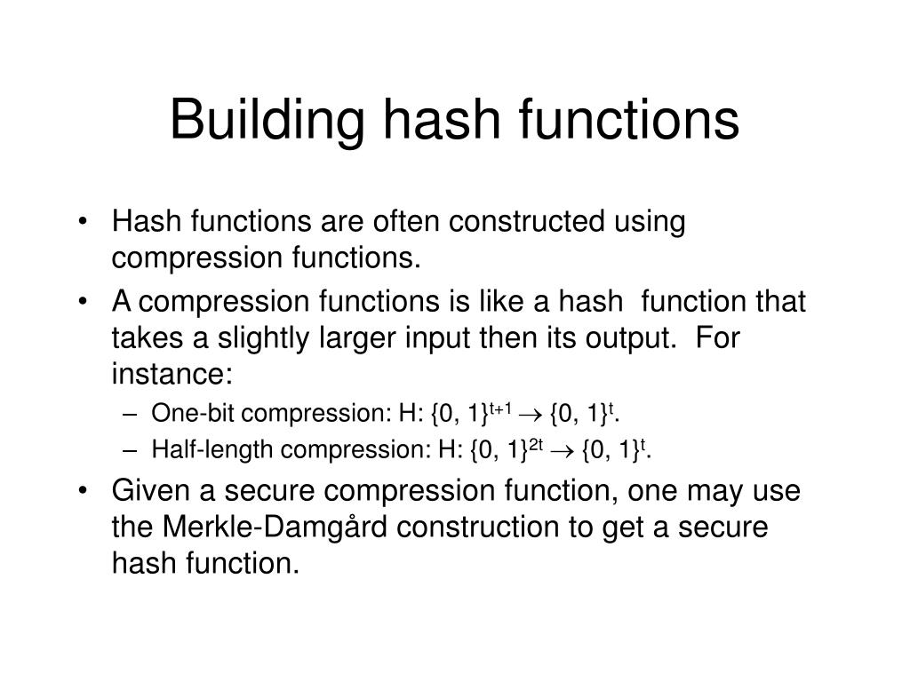 Building hash functions • Hash functions are often constructed using compression functions. • A compression functions is like a hash function that takes a slightly larger input then its output. For instance: • One-bit compression: H: {0, 1}t+1 {0, 1}t. • Half-length compression: H: {0, 1}2t {0, 1}t. • Given a secure compression function, one may use the Merkle-Damgård construction to get a secure hash function.