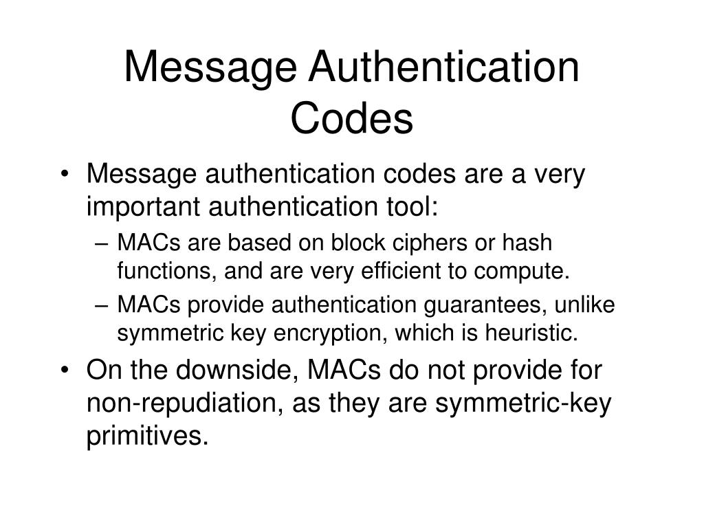 Message Authentication Codes • Message authentication codes are a very important authentication tool: • MACs are based on block ciphers or hash functions, and are very efficient to compute. • MACs provide authentication guarantees, unlike symmetric key encryption, which is heuristic. • On the downside, MACs do not provide for non-repudiation, as they are symmetric-key primitives.