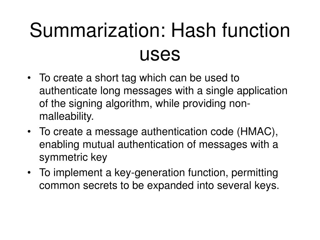 Summarization: Hash function uses • To create a short tag which can be used to authenticate long messages with a single application of the signing algorithm, while providing non-malleability. • To create a message authentication code (HMAC), enabling mutual authentication of messages with a symmetric key • To implement a key-generation function, permitting common secrets to be expanded into several keys.