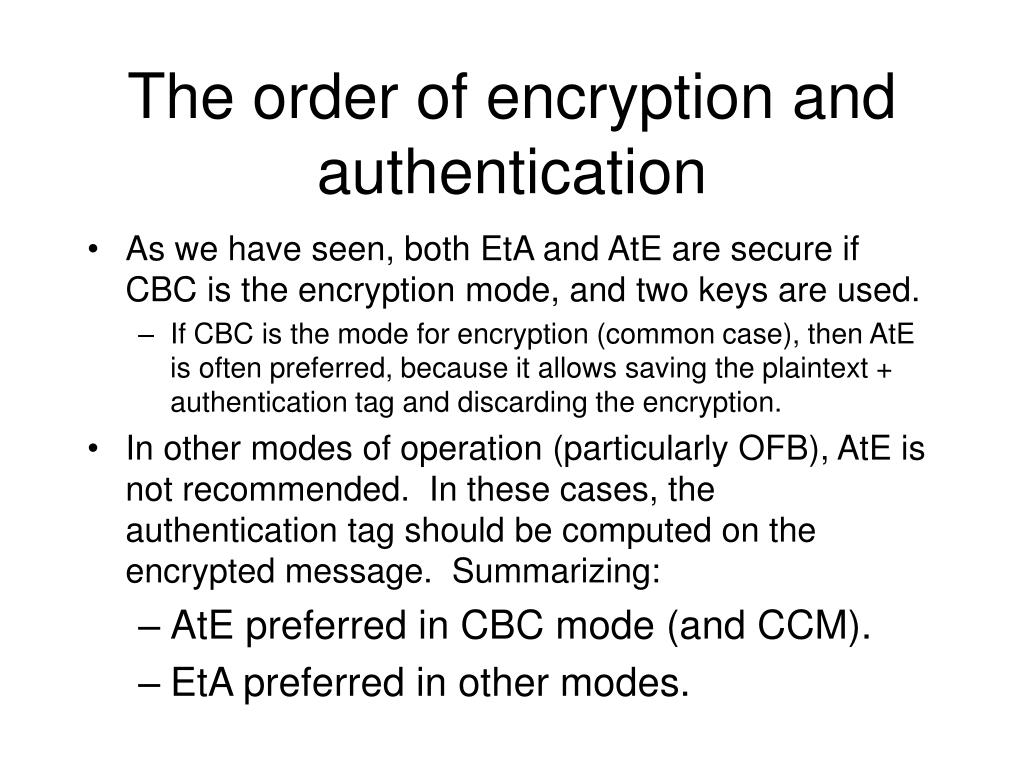 The order of encryption and authentication • As we have seen, both EtA and AtE are secure if CBC is the encryption mode, and two keys are used. • If CBC is the mode for encryption (common case), then AtE is often preferred, because it allows saving the plaintext + authentication tag and discarding the encryption. • In other modes of operation (particularly OFB), AtE is not recommended. In these cases, the authentication tag should be computed on the encrypted message. Summarizing: • AtE preferred in CBC mode (and CCM). • EtA preferred in other modes.