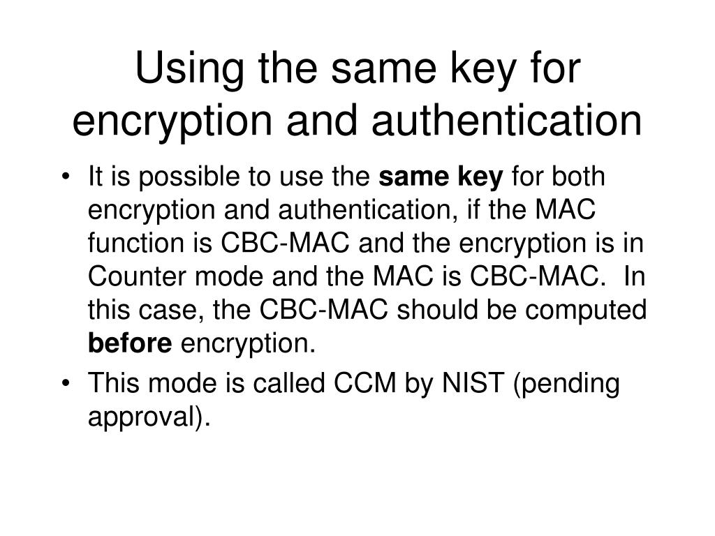 Using the same key for encryption and authentication • It is possible to use the same key for both encryption and authentication, if the MAC function is CBC-MAC and the encryption is in Counter mode and the MAC is CBC-MAC. In this case, the CBC-MAC should be computed before encryption. • This mode is called CCM by NIST (pending approval).