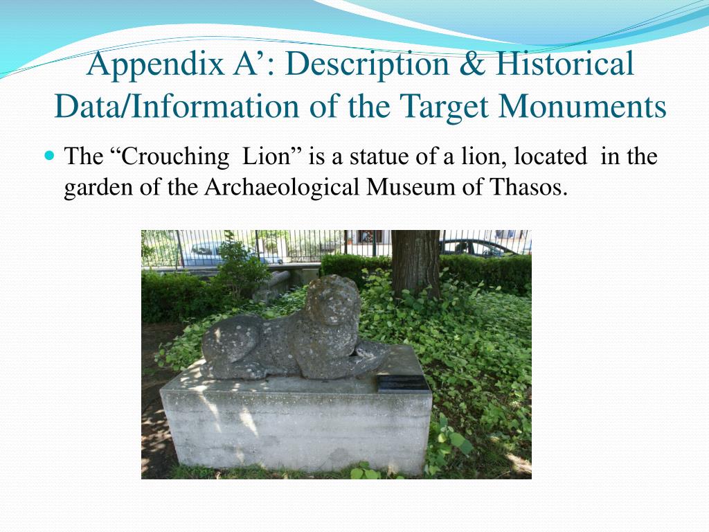 Appendix A’: Description & Historical Data/Information of the Target Monuments • The “Crouching Lion” is a statue of a lion, located in the garden of the Archaeological Museum of Thasos.
