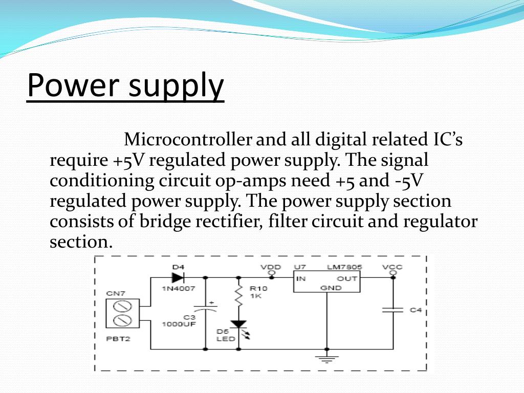 Power supply Microcontroller and all digital related IC’s require +5V regulated power supply. The signal conditioning circuit op-amps need +5 and -5V regulated power supply. The power supply section consists of bridge rectifier, filter circuit and regulator section.