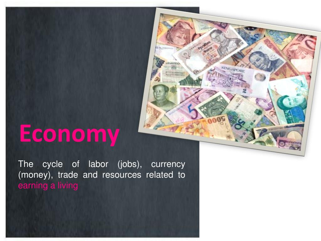 Economy The cycle of labor (jobs), currency (money), trade and resources related to earning a living