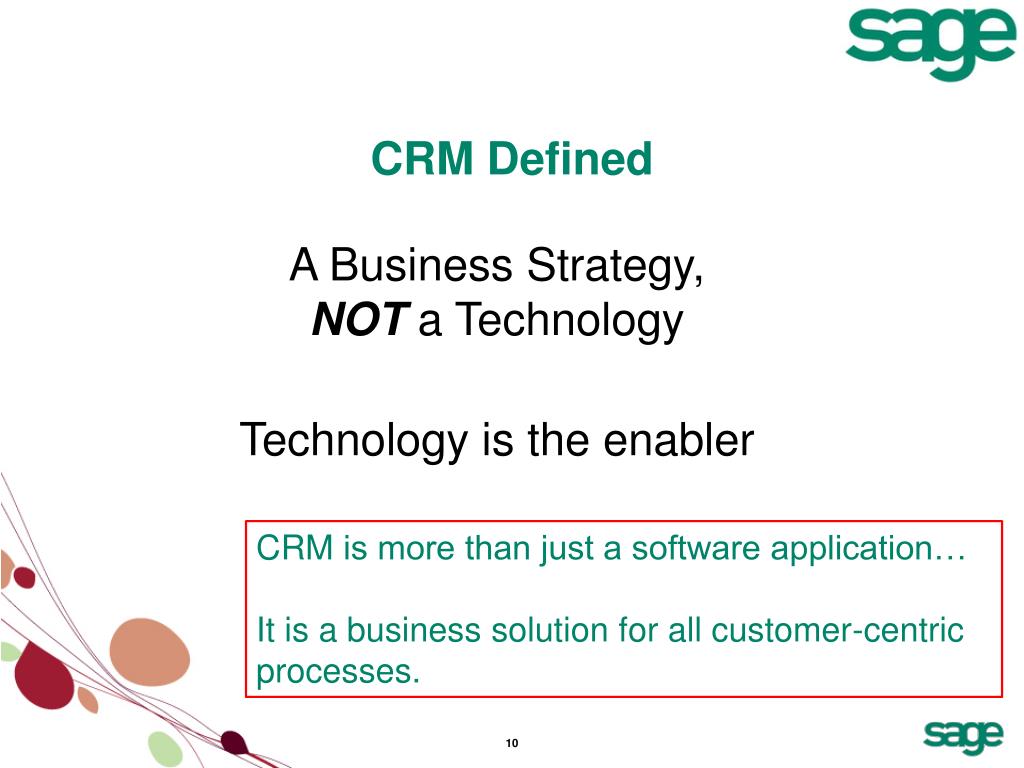 CRM Defined A Business Strategy, NOT a Technology Technology is the enabler CRM is more than just a software application… It is a business solution for all customer-centric processes.