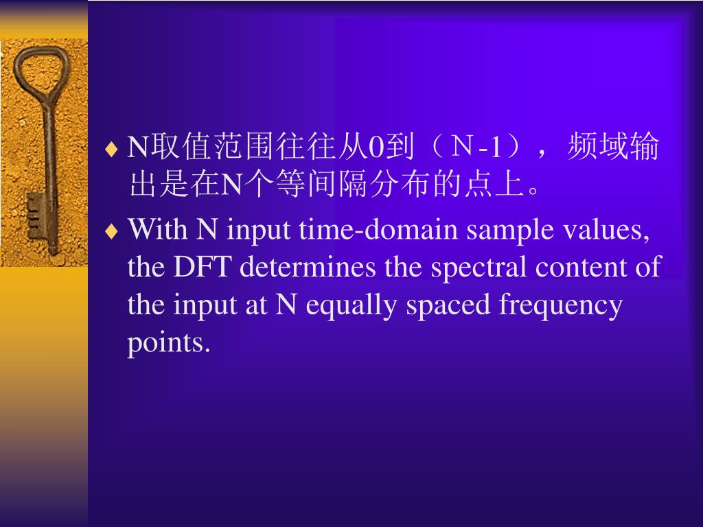 N取值范围往往从0到(N-1),频域输出是在N个等间隔分布的点上。N取值范围往往从0到(N-1),频域输出是在N个等间隔分布的点上。 • With N input time-domain sample values, the DFT determines the spectral content of the input at N equally spaced frequency points.