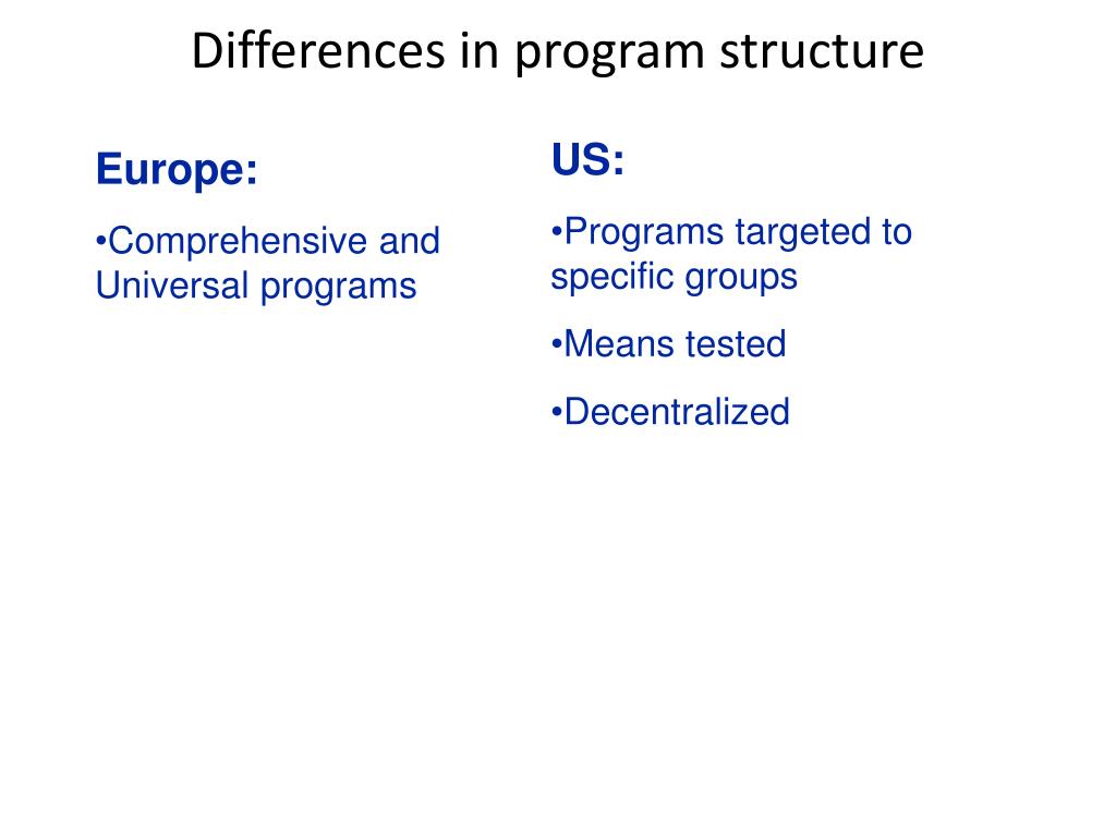 Differences in program structure US: • Programs targeted to specific groups • Means tested • Decentralized Europe: • Comprehensive and Universal programs