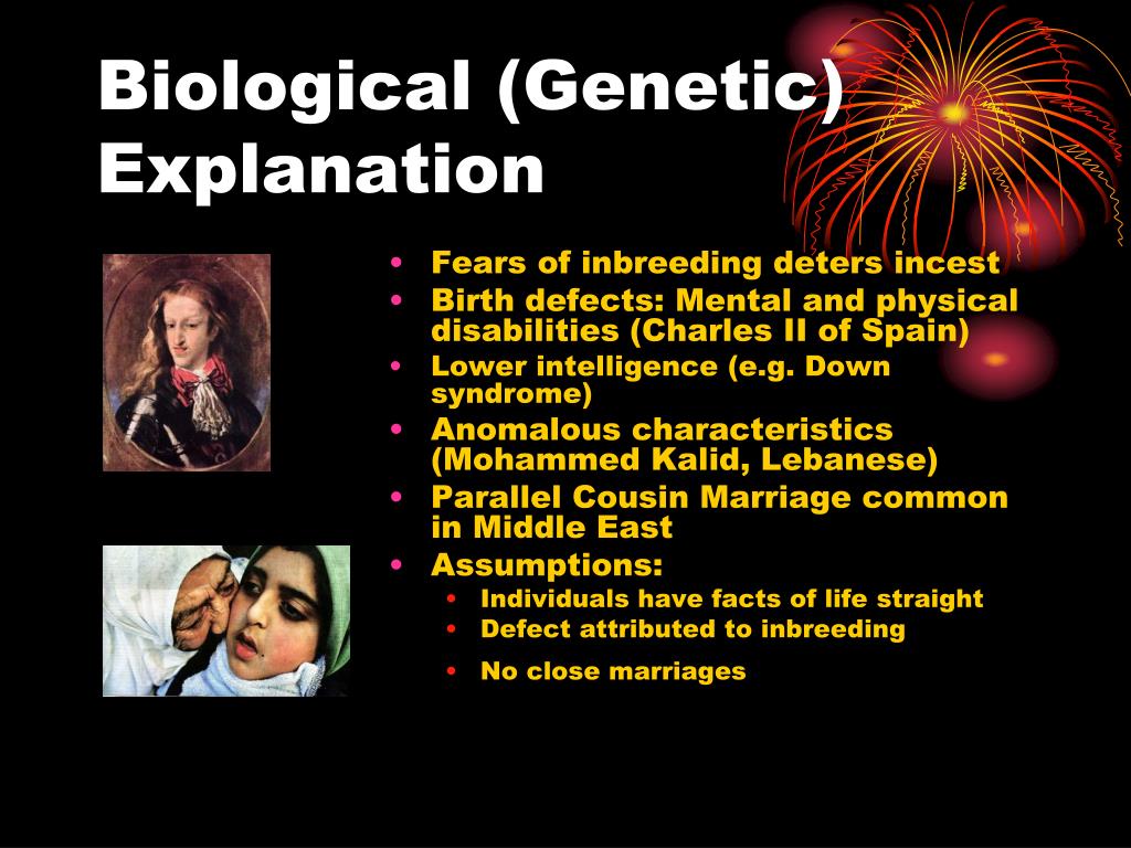 Biological (Genetic) Explanation • Fears of inbreeding deters incest • Birth defects: Mental and physical disabilities (Charles II of Spain) • Lower intelligence (e.g. Down syndrome) • Anomalous characteristics (Mohammed Kalid, Lebanese) • Parallel Cousin Marriage common in Middle East • Assumptions: • Individuals have facts of life straight • Defect attributed to inbreeding • No close marriages