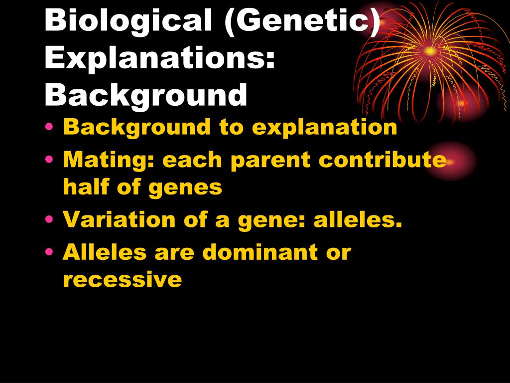 Biological (Genetic) Explanations: Background • Background to explanation • Mating: each parent contribute half of genes • Variation of a gene: alleles. • Alleles are dominant or recessive