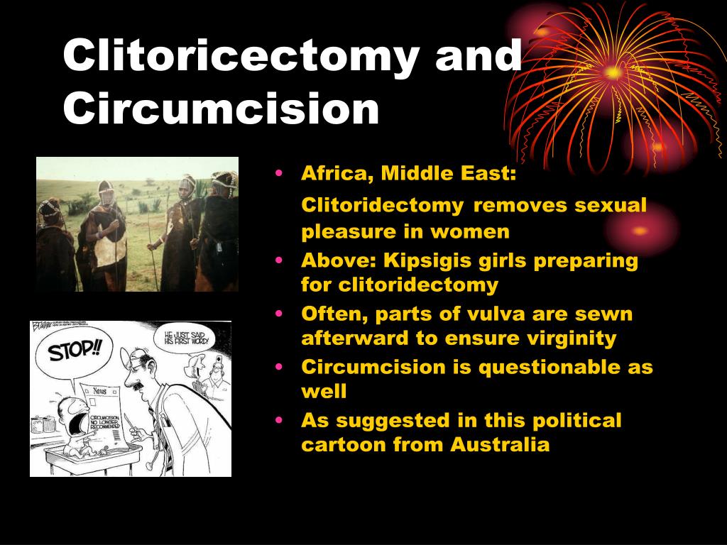 Clitoricectomy and Circumcision • Africa, Middle East: Clitoridectomyremoves sexual pleasure in women • Above: Kipsigis girls preparing for clitoridectomy • Often, parts of vulva are sewn afterward to ensure virginity • Circumcision is questionable as well • As suggested in this political cartoon from Australia