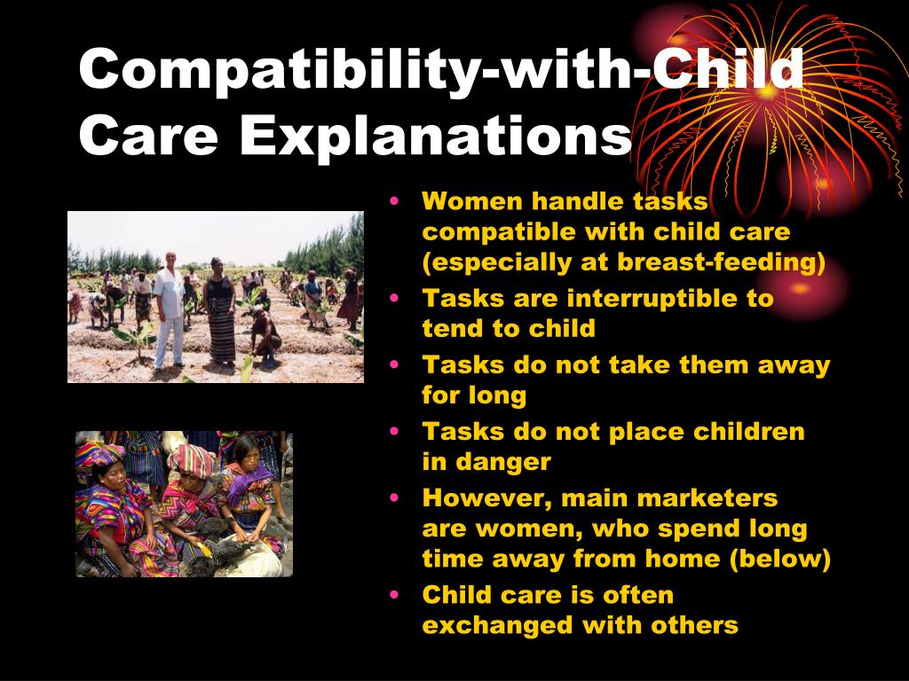 Compatibility-with-Child Care Explanations • Women handle tasks compatible with child care (especially at breast-feeding) • Tasks are interruptible to tend to child • Tasks do not take them away for long • Tasks do not place children in danger • However, main marketers are women, who spend long time away from home (below) • Child care is often exchanged with others