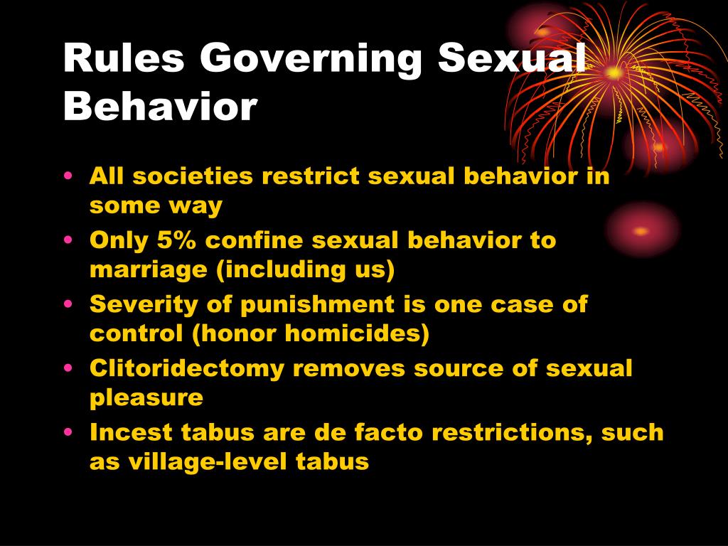 Rules Governing Sexual Behavior • All societies restrict sexual behavior in some way • Only 5% confine sexual behavior to marriage (including us) • Severity of punishment is one case of control (honor homicides) • Clitoridectomy removes source of sexual pleasure • Incest tabus are de facto restrictions, such as village-level tabus