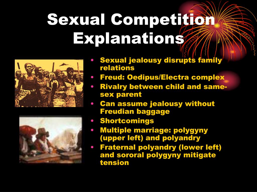 Sexual Competition Explanations • Sexual jealousy disrupts family relations • Freud: Oedipus/Electra complex • Rivalry between child and same-sex parent • Can assume jealousy without Freudian baggage • Shortcomings • Multiple marriage: polygyny (upper left) and polyandry • Fraternal polyandry (lower left) and sororal polygyny mitigate tension