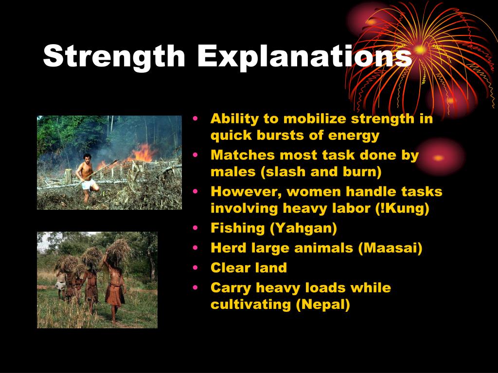 Strength Explanations • Ability to mobilize strength in quick bursts of energy • Matches most task done by males (slash and burn) • However, women handle tasks involving heavy labor (!Kung) • Fishing (Yahgan) • Herd large animals (Maasai) • Clear land • Carry heavy loads while cultivating (Nepal)