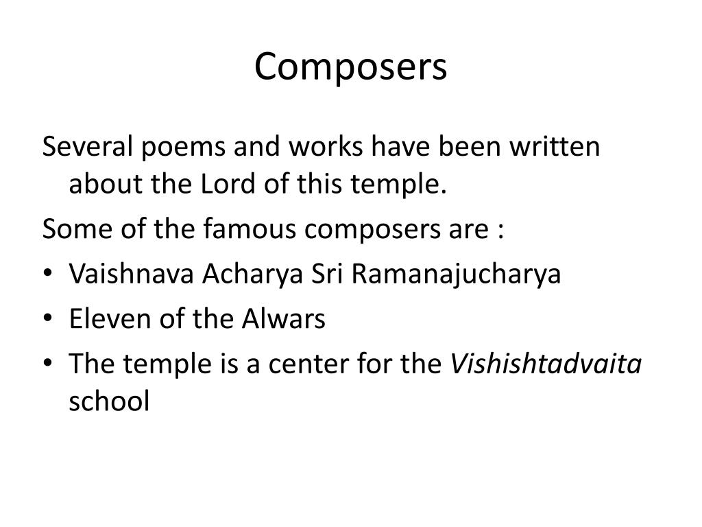 Composers Several poems and works have been written about the Lord of this temple. Some of the famous composers are : • VaishnavaAcharya Sri Ramanajucharya • Eleven of the Alwars • The temple is a center for the Vishishtadvaita school