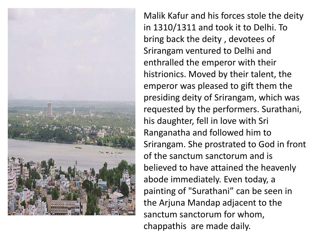 MalikKafur and his forces stole the deity in 1310/1311 and took it to Delhi. To bring back the deity , devotees of Srirangam ventured to Delhi and enthralled the emperor with their histrionics. Moved by their talent, the emperor was pleased to gift them the presiding deity of Srirangam, which was requested by the performers. Surathani, his daughter, fell in love with Sri Ranganatha and followed him to Srirangam. She prostrated to God in front of the sanctum sanctorum and is believed to have attained the heavenly abode immediately. Even today, a painting of "Surathani” can be seen in the ArjunaMandap adjacent to the sanctum sanctorum for whom, chappathisare made daily.
