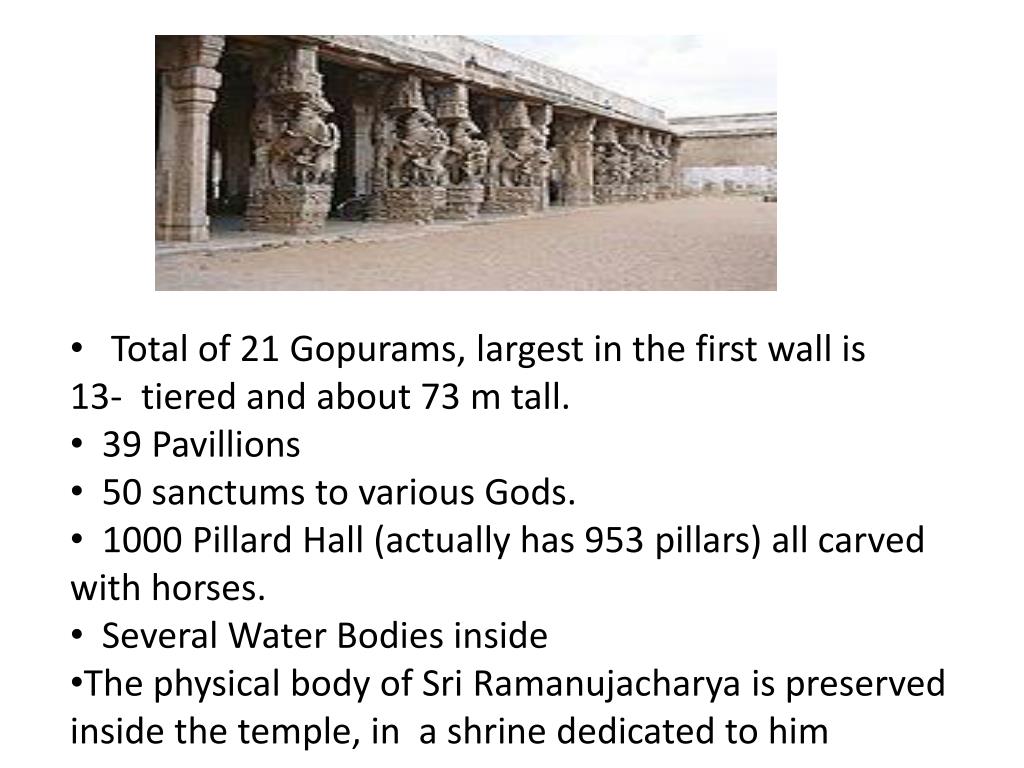 Total of 21 Gopurams, largest in the first wall is 13- tiered and about 73 m tall. • 39 Pavillions • 50 sanctums to various Gods. • 1000 Pillard Hall (actually has 953 pillars) all carved with horses. • Several Water Bodies inside • The physical body of Sri Ramanujacharya is preserved inside the temple, in a shrine dedicated to him