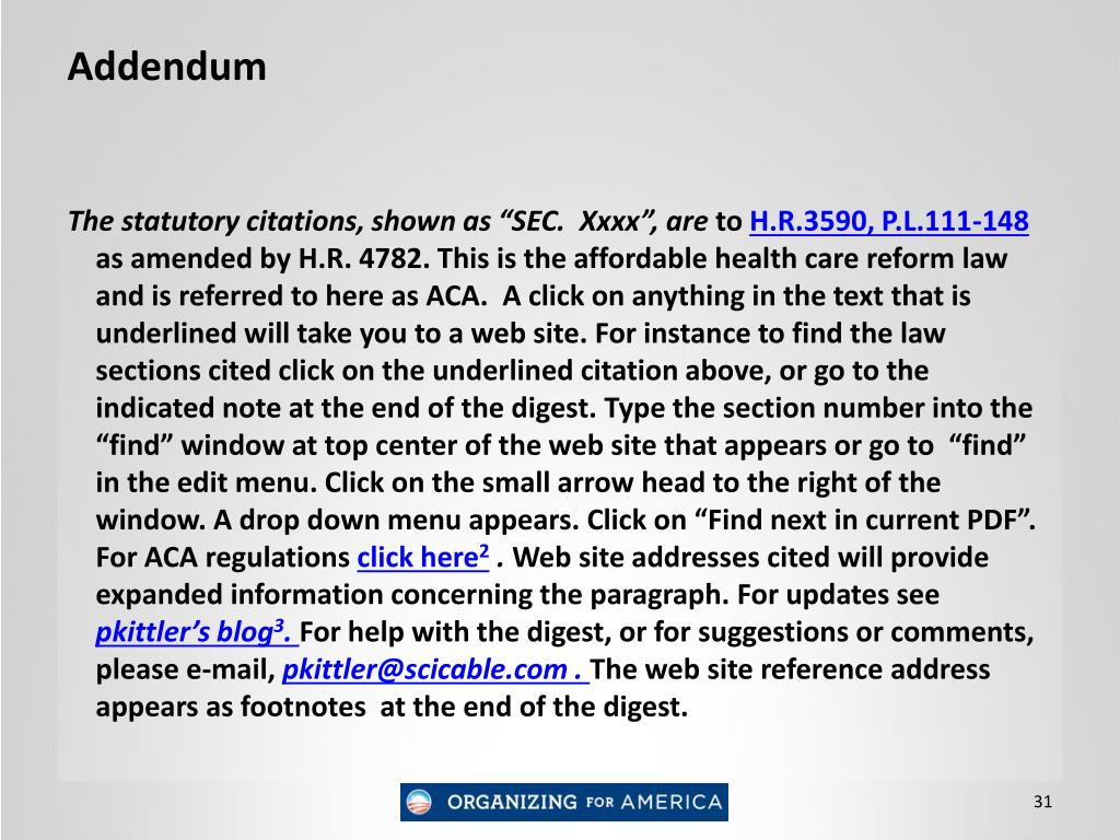 Addendum The statutory citations, shown as “SEC. Xxxx”, are to H.R.3590, P.L.111-148as amended by H.R. 4782. This is the affordable health care reform law and is referred to here as ACA. A click on anything in the text that is underlined will take you to a web site. For instance to find the law sections cited click on the underlined citation above, or go to the indicated note at the end of the digest. Type the section number into the “find” window at top center of the web site that appears or go to “find” in the edit menu. Click on the small arrow head to the right of the window. A drop down menu appears. Click on “Find next in current PDF”. For ACA regulations click here2 . Web site addresses cited will provide expanded information concerning the paragraph. For updates see pkittler’s blog3. For help with the digest, or for suggestions or comments, please e-mail, pkittler@scicable.com . The web site reference address appears as footnotes at the end of the digest.