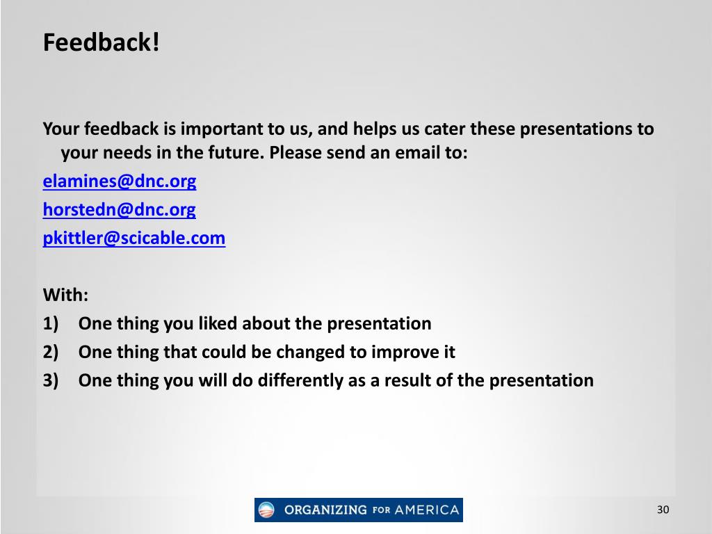 Feedback! Your feedback is important to us, and helps us cater these presentations to your needs in the future. Please send an email to: elamines@dnc.org horstedn@dnc.org pkittler@scicable.com With: One thing you liked about the presentation One thing that could be changed to improve it One thing you will do differently as a result of the presentation