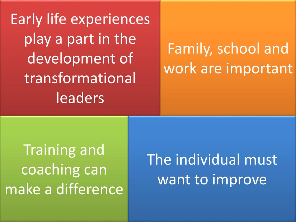 Early life experiences play a part in the development of transformational leaders Family, school and work are important Training and coaching can make a difference The individual must want to improve