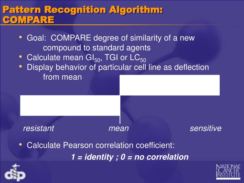resistant mean sensitive Pattern Recognition Algorithm:COMPARE • Goal: COMPARE degree of similarity of a new • compound to standard agents • Calculate mean GI50, TGI or LC50 • Display behavior of particular cell line as deflection • from mean • Calculate Pearson correlation coefficient: 1 = identity ; 0 = no correlation