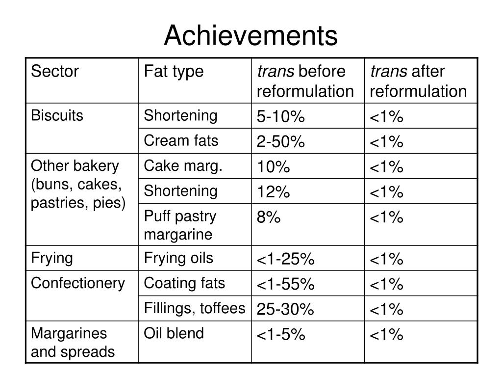 Where do we stand now? • The use of hydrogenated vegetable oils (HVOs) has been eliminated in almost all mainstream food production in the UK • Some of the oils and fats processors have closed down their hydrogenation plants • Others still operate but predominantly for the production of fully hydrogenated oils (which contain <1% trans) for use in limited but very specific applications • There is little likelihood of a return to the use of partially hydrogenated oils but the use of fully hydrogenated oils could give the industry scope for further development and optimisation.