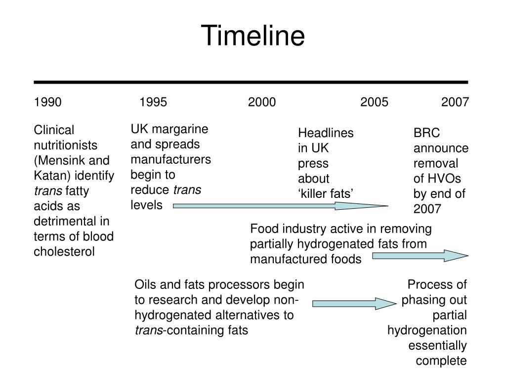 Timeline 1990 1995 2000 2005 2007 UK margarine and spreads manufacturers begin to reduce trans levels Clinical nutritionists (Mensink and Katan) identify trans fatty acids as detrimental in terms of blood cholesterol Headlines in UK press about ‘killer fats’ BRC announce removal of HVOs by end of 2007 Food industry active in removing partially hydrogenated fats from manufactured foods Oils and fats processors begin to research and develop non-hydrogenated alternatives to trans-containing fats Process of phasing out partial hydrogenation essentially complete
