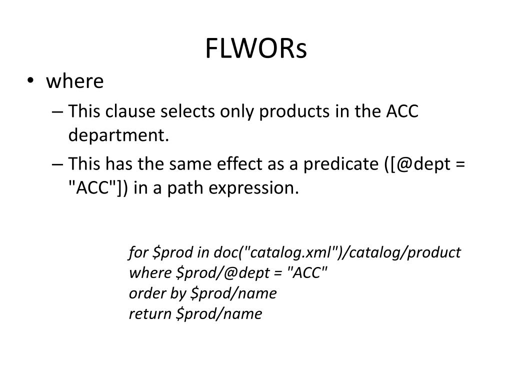 FLWORs • where • This clause selects only products in the ACC department. • This has the same effect as a predicate ([@dept = "ACC"]) in a path expression. for $prod in doc("catalog.xml")/catalog/product where $prod/@dept = "ACC" order by $prod/name return $prod/name